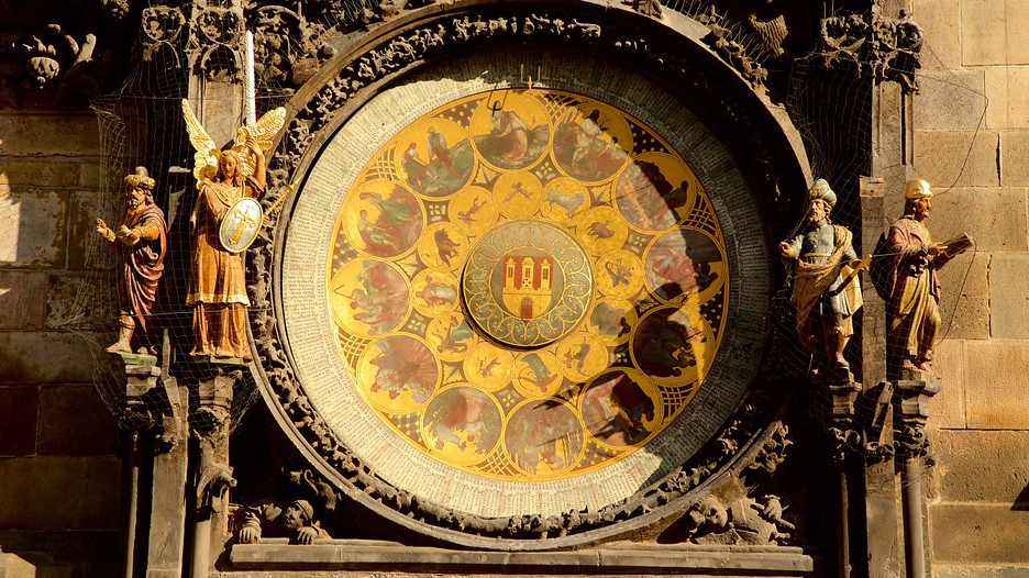 天文鐘最厲害就是不只是一個時鐘建築物,更精準刻畫出地球、太陽及月亮間的軌道,大圓圈顯示一天24小時的時間,藍色為白晝紅色為夜晚,另一個比較小的圓圈則顯示該時間太陽落在哪個星座,最吸引的人包括耶穌12門徒在內的活動木偶,每到整點天文鐘上方的窗戶打開,一旁的死神開始鳴鐘,耶穌的門徒在聖保羅的帶領下一一現身,最後以雞啼和鐘響結束,每天到整點廣場都會聚集一堆民眾觀看。