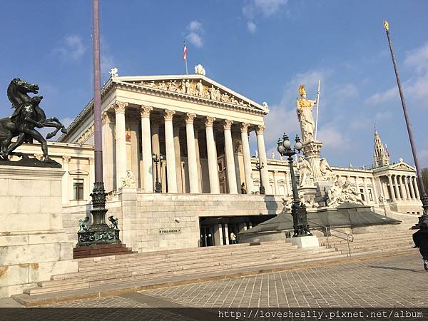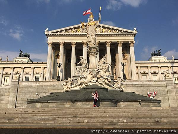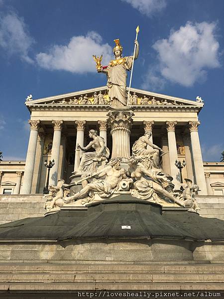 而國會大廈前的噴泉雕像足足高達四米,而雕像人物是象徵智慧的雅典娜女神,是由卡爾.庫德曼(Karl Kundmann)所設計,雕像基座旁的塑像象徵著奧匈帝國的四大河流:多瑙河、萊茵河、易北河和莫爾達瓦河。